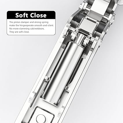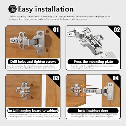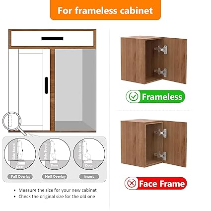 CONSISTENT QUALITY: The hinges meet the standards and certifications of ISO9001, ISO14001, BHMA, KCMA and SGS. Heavy-duty stainless steel finish is tested for durability hundreds of thousands of times. Suitable for face-frame cabinets. Such as kitchen cabinet doors, closets, TV cabinets, bookcases, wine coolers.